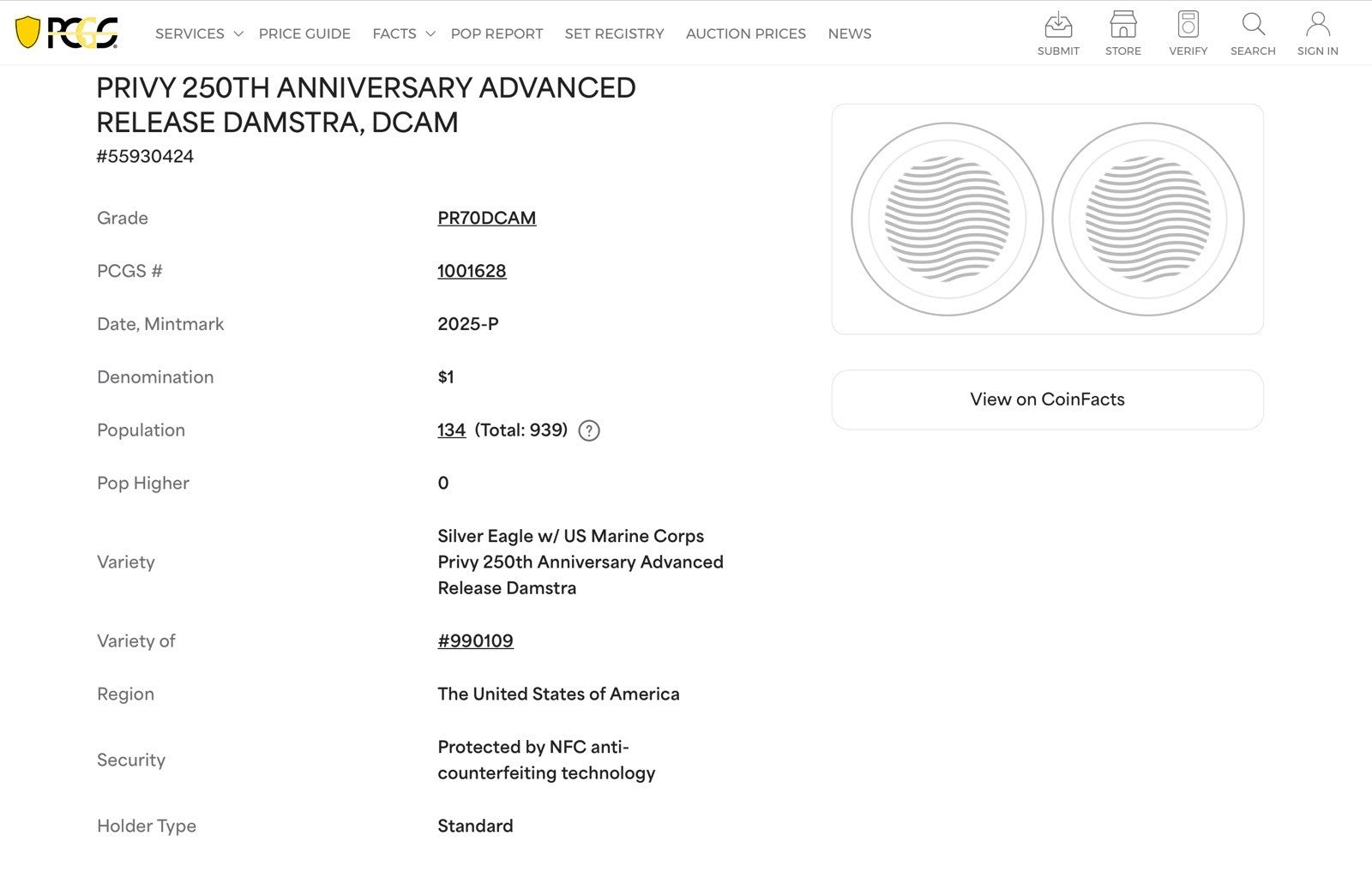 The 2025-P Silver Eagle W/ Marine Privy PCGS PR70DCAM 250th Anniv Advanced Release is a highly sought-after coin celebrating the 250th anniversary of the United States Marine Corps. This American Eagle coin is composed of 99.9% silver and contains 1 oz of precious metal content. It is a limited mintage coin struck in proof finish and certified by PCGS as PR70. Produced by the U.S. Mint, this unique coin features a special Marine Corps privy design, making it a valuable addition to any coin collection. Damstra signed with only 134 pcs as per PCGS